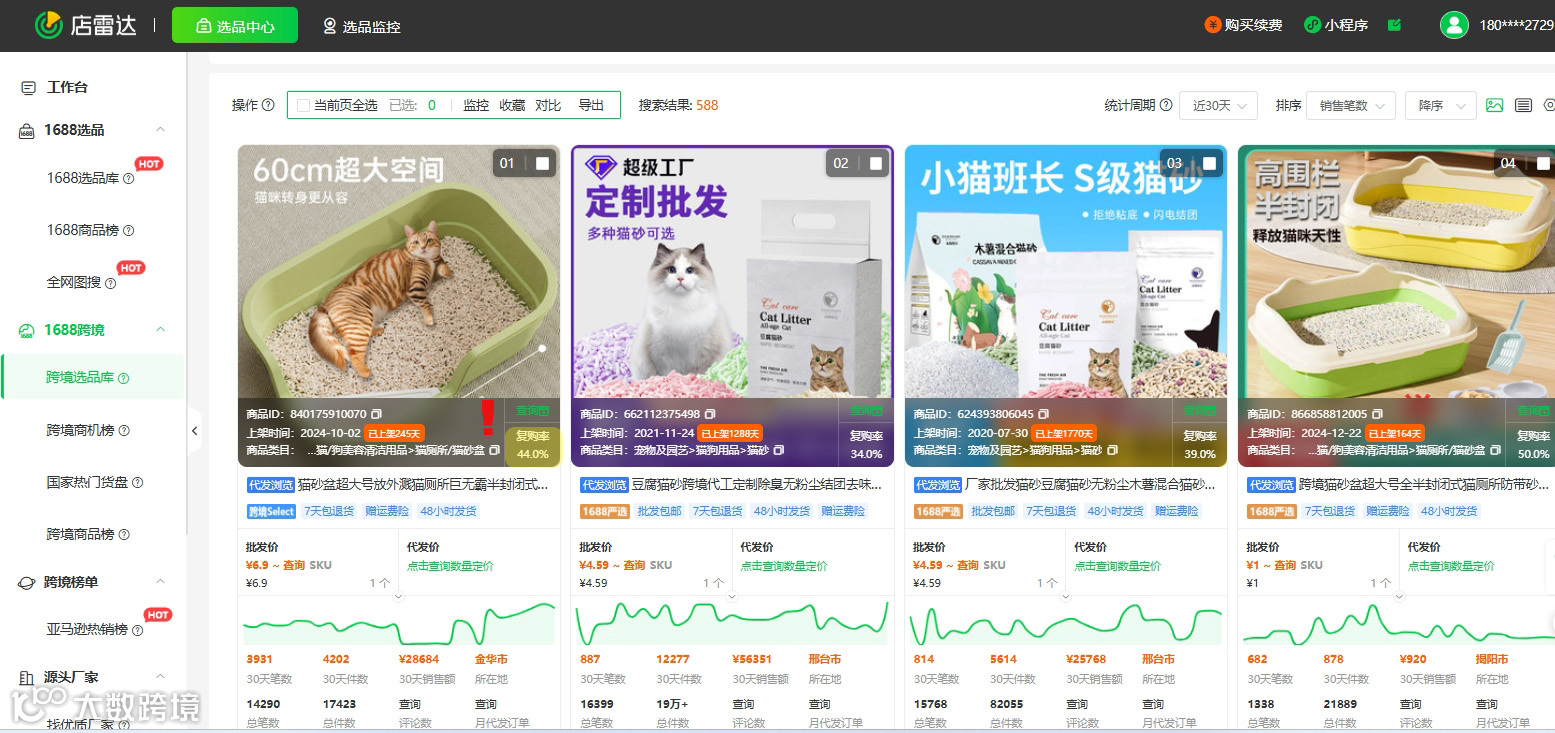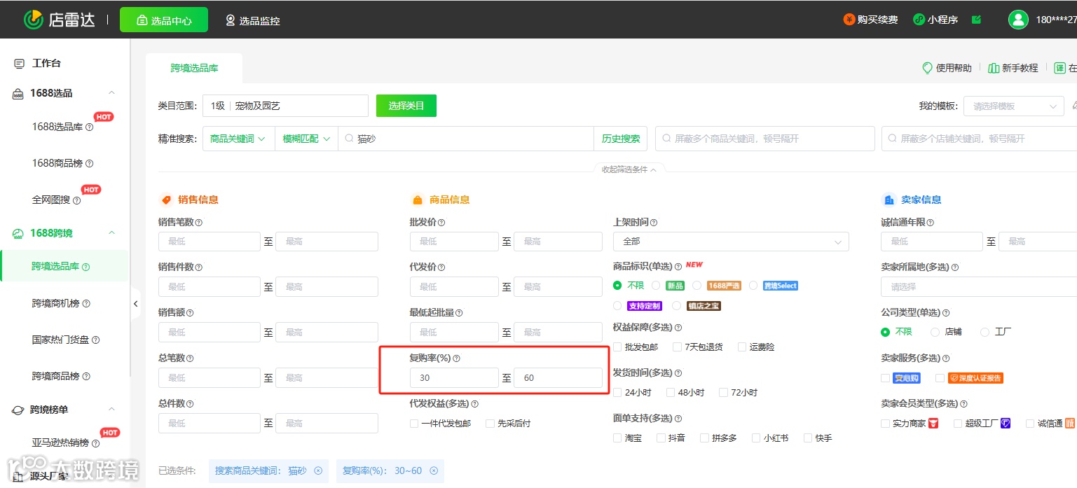像猫砂、猫砂盆、隔尿垫这样日常消耗较大,如果质量好,往往消费者粘性会较高,商家们可以通过店雷达选品库筛选寻找复购率较高的商品,寻找质量优的产品,以形成稳定的消费关系。此外,还可以和除臭剂等关联销售。
