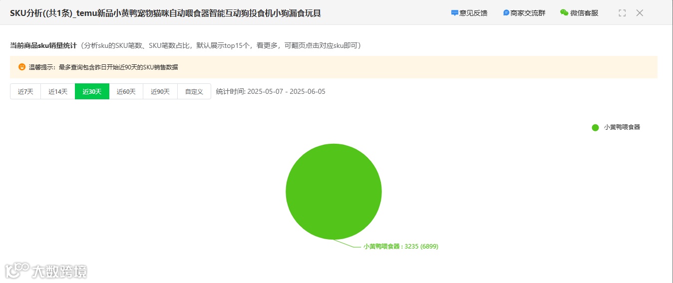 榜单中小黄鸭自动喂食器、智能逗猫球等销售笔数较高,以小黄鸭自动喂食器为例,店雷达-SKU分析中可看到该产品只有一个颜色和规格,卖家们可以由此发散,增加多种SKU,满足多种需求,同时进行产品外观、功能创新,吸引更多年轻消费者。