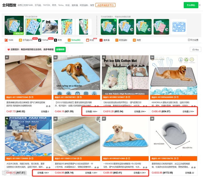 随着欧美市场夏季高温,宠物消暑用品激增,可以看到宠物凉席冲到了跨境热销top1,通过店雷达全网图搜看各平台类似商品情况,因为产品低价便携的特点,在temu上反而是卖的最好的。同时夏季跳蚤蚊虫活跃,驱虫产品需求集中,驱虫项圈、驱虫喷剂销路也是不错的选品方向。