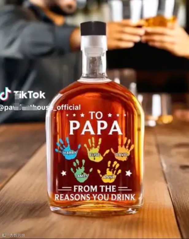 比如这样一款轻定制的威士忌酒瓶,酒瓶图案由彩色油漆笔绘制,商家在销售的时候完全可以提供空白玻璃瓶+彩色油漆笔套装,鼓励买家亲手绘制图案,强调DIY的乐趣和独特性。