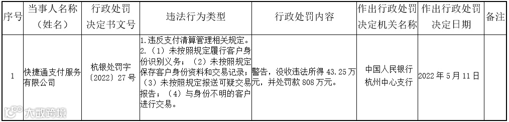 2022年5月,人民银行杭州中心支行发布的行政处罚信息显示,快捷通支付因违反支付清算管理相关规定、反洗钱相关管理规定(包括:①未按照规定履行客户身份识别义务;②未按照规定保存客户身份资料和交易记录;③未按照规定报送可疑交易报告;④与身份不明的客户进行交易等)被警告,没收违法所得43.25万元并处罚款808万元,合计罚没884.25万元。