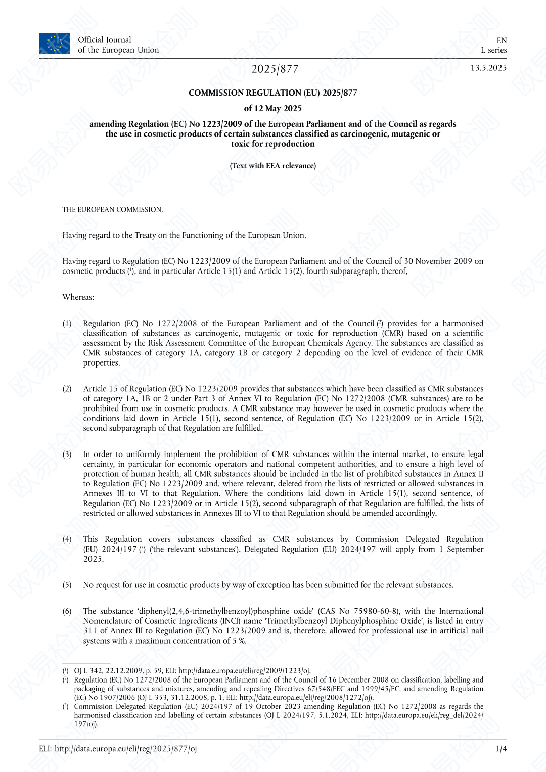 根据欧盟官方公报 Regulation (EU) 2025/877,自2025年9月1日起,以下物质将
