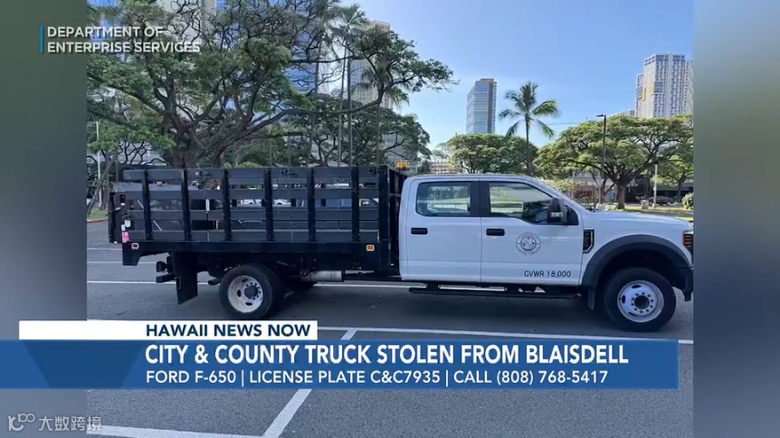 援引夏威夷即時新聞:檀香山市政府正在尋找一輛從Neal S. Blaisdell中心停車場被盜的平板卡車。市政府官員表示,這輛卡車於週二(1月13日)凌晨5點左右從企業服務部被盜。這輛福特F650卡車的車牌號碼為C&C7935。監視器畫面顯示,司機駕車穿過道閘,撞彎後駛離車道。如有任何線索,請致電檀香山警察局或Neal S. Blaisdell中心樓宇服務主管,電話號碼為(808)768-5417。