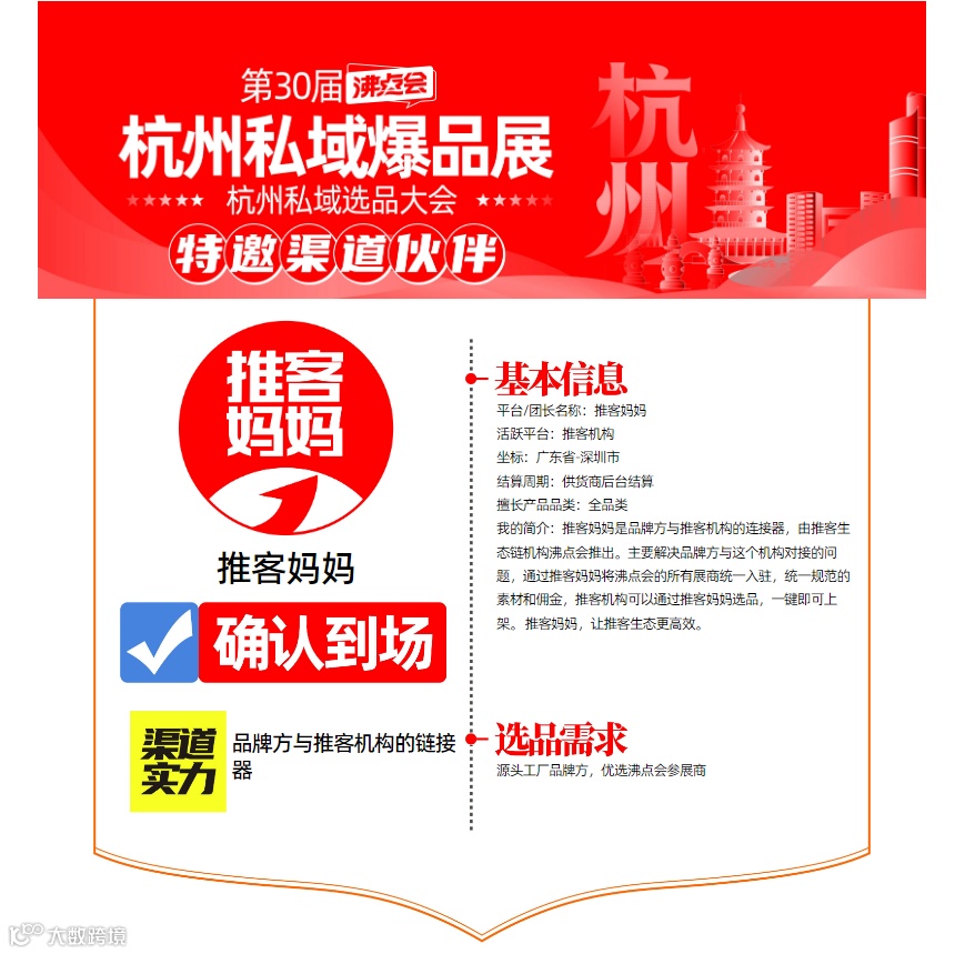 推客妈妈是品牌方与推客机构的连接器,由推客生态链机构沸点会推出。主要解决品牌方与这个机构对接的问题,通过推客妈妈将沸点会的所有展商统一入驻,统一规范的素材和佣金,推客机构可以通过推客妈妈选品,一键即可上架。