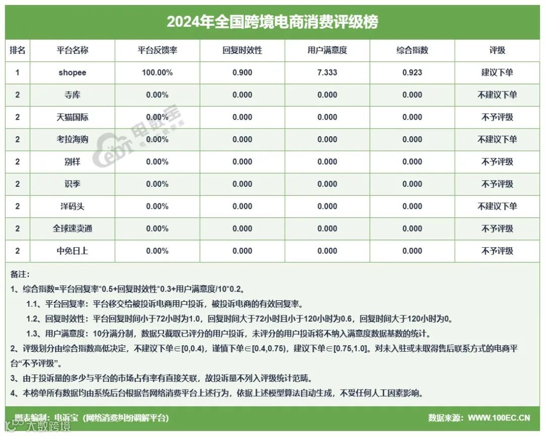 在“2024年全国跨境电商消费评级榜”中,寺库、考拉海购、洋码头获“不建议下单”评级;天猫国际、别样、识季、全球速卖通、中免日上获“不予评级”。