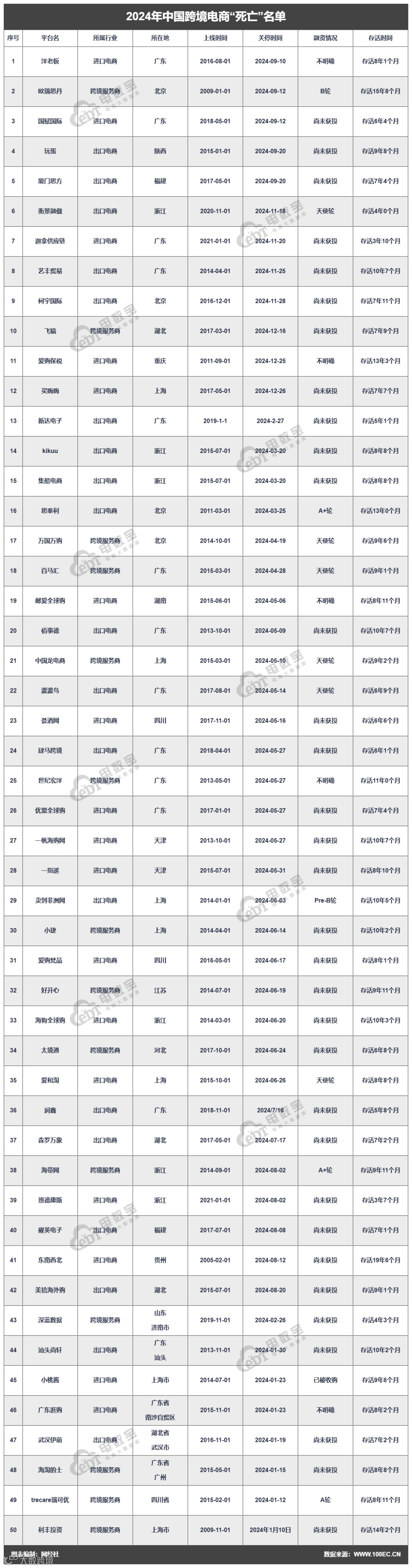 据“电数宝”监测数据显示,2024年跨境电商领域企业“死亡”数达50家,包括美拾海外购、东南西北、擢英电子等平台。