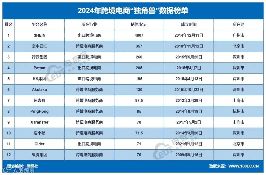 2024年跨境电商“独角兽”公司共12家,总估值达6427亿元人民币,数量比2023年的13家减少1家,估值减少了195亿元。