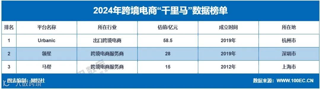 2024年跨境电商“千里马”公司共3家,总估值达101.5亿元人民币,数量比2023年的4家减少1家,估值减少了172.5亿元。