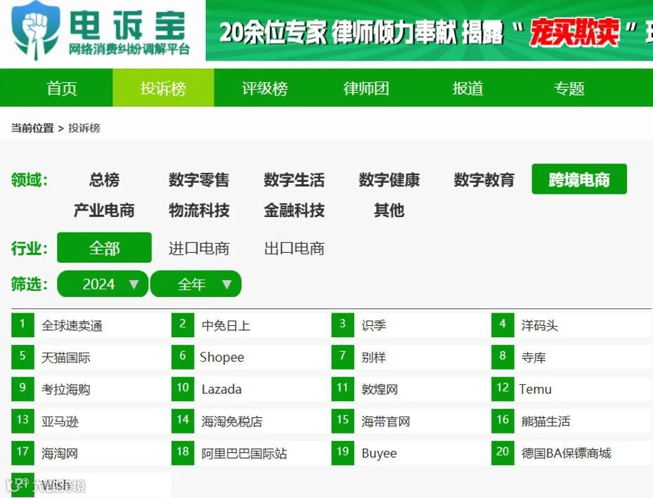 根据网络消费纠纷调解平台“电诉宝”的数据显示,2024年跨境电商领域投诉量靠前的平台依次为全球速卖通、中免日上、识季、洋码头、天猫国际、别样、寺库、考拉海购、Lazada、敦煌网、Temu、亚马逊、海淘免税店等。