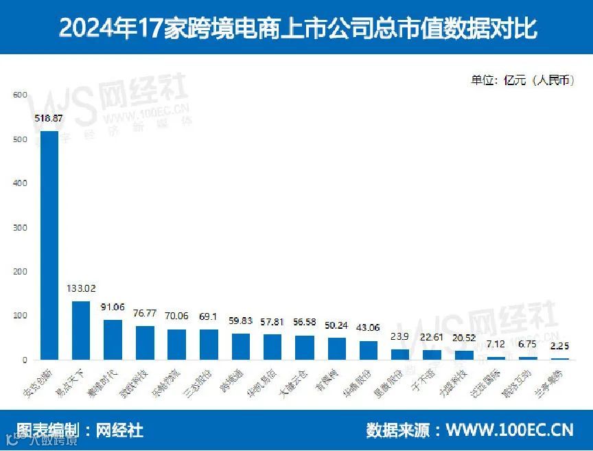 截至2025年1月1日,17家跨境电商上市公司总市值达1309.55亿元人民币,平均市值约为77.03亿元,数量上较2024年增加一家。