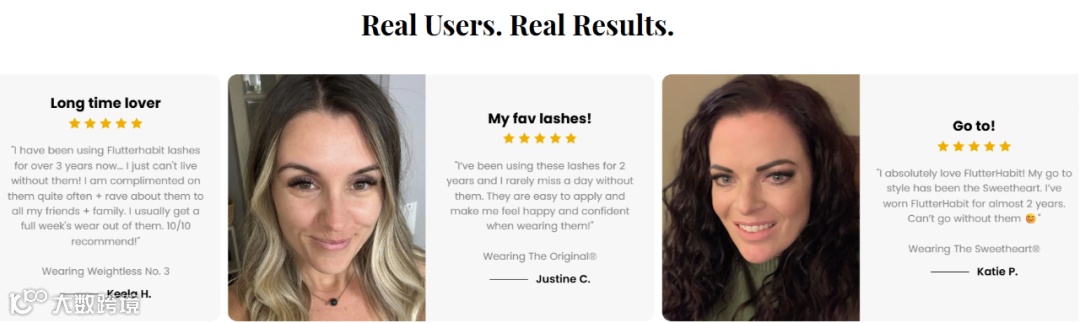 独立站内,“Real Users. Real Results.”板块真实的展示了关于FlutterHabit各种假睫毛产品的评价,许多用户表示其佩戴效果自然、舒适,且持久度高,能够满足日常和特殊场合的妆容需求等,大量真实用户的好评也提高了潜在用户购买转化。