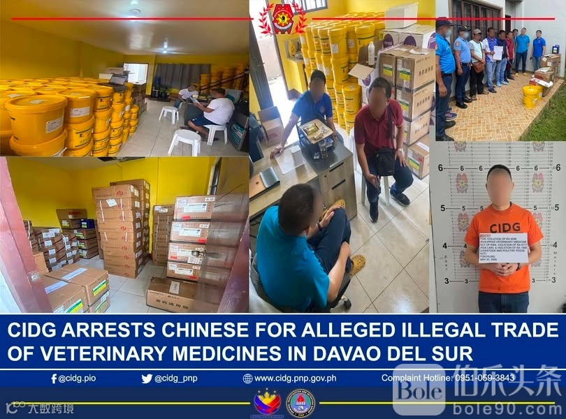 5月30日,菲律宾国家警察刑事调查和侦查组(CIDG)在一次特别行动中成功 捣毁一处非法兽药分销窝点。执法人员在马尼拉某仓库现场抓获一名中国籍犯罪嫌疑人,查获大批未经菲律宾食品药物管理局(FDA)注册的兽用药品及饲料添加剂,涉案金额高达300万比索(约合人民币36万元)。