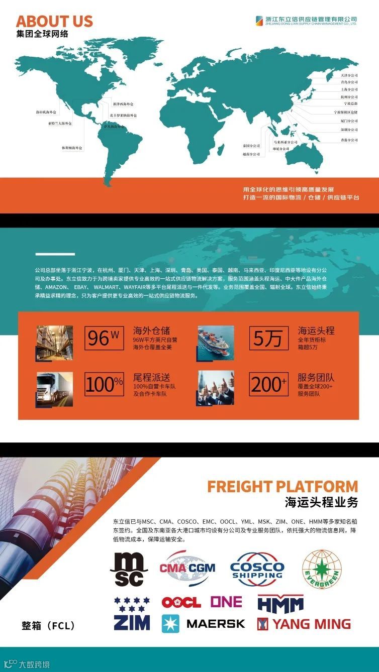 我们提供涵盖头程运输、海外仓储、国内保税仓、清关及尾程派送的一站式供应链解决方案,在全国各大港口设有分公司,服务众多头部中大件跨境电商卖家。