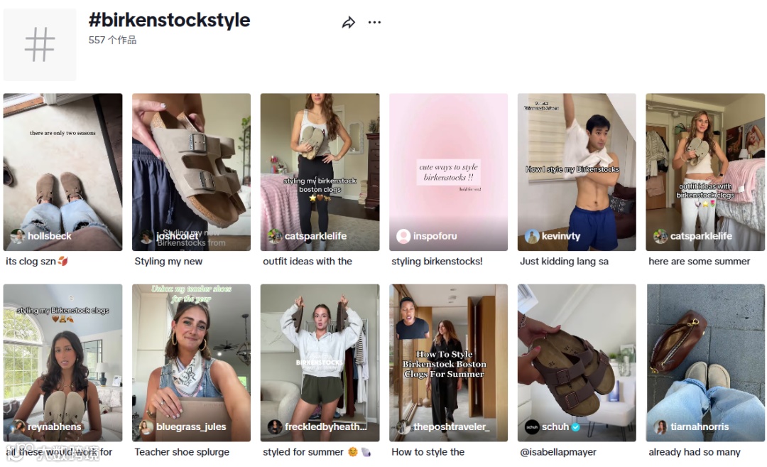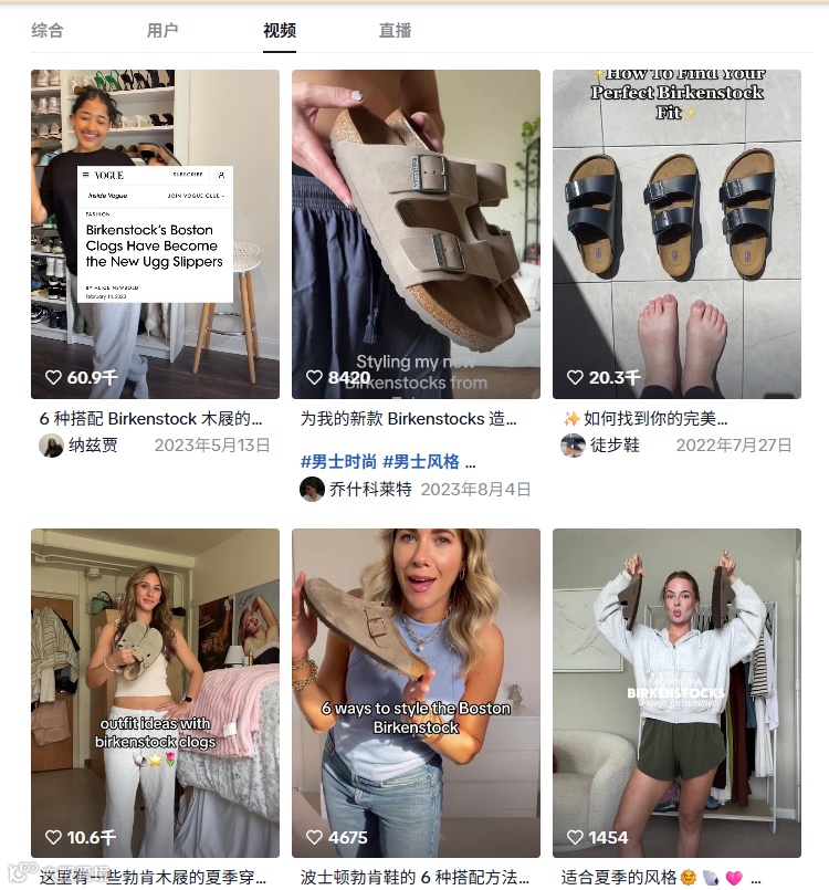 图源:小红书TikTok上,#Birkenstock话题播放量已突破10亿次。品牌官方在TikTok发起#BirkenstockStyle挑战赛,鼓励用户分享自己的勃肯鞋穿搭,参与者发布的优质视频能获得品牌周边或优惠券。