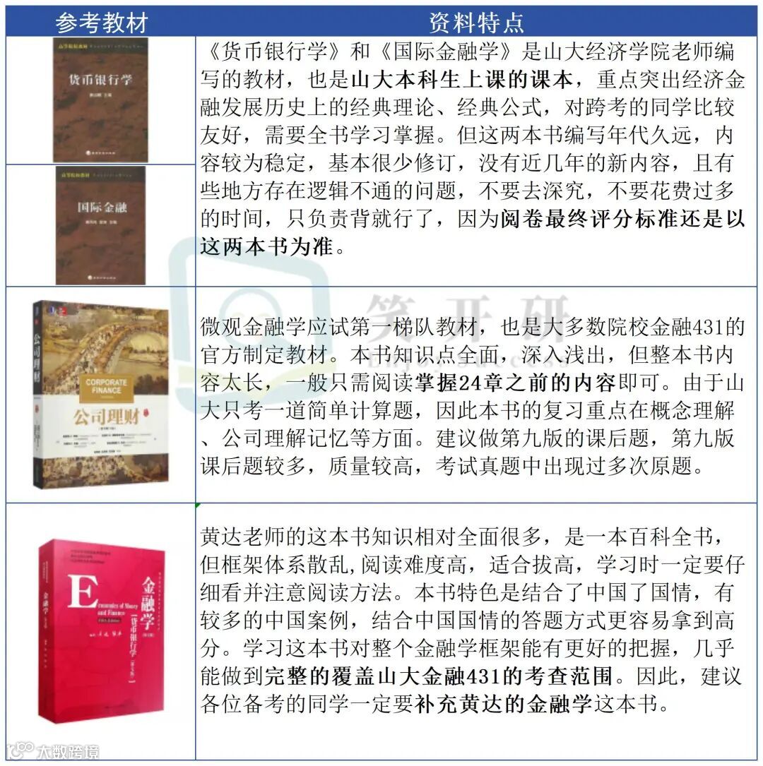注:三个学院的初试参考书相同,但前3本是山大之前指定的参考书,近几年山大不再指定金融专硕的初试参考书目,在之前三本指定参考书的基础上,建议同学们在备考时补充黄达《金融学》。