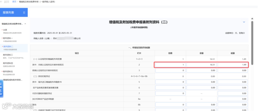 点击【我要填表】,切换到申报表界面,勾选的铁路电子客票数据自动带入《增值税及附加税费申报表附列资料(二)》(本期进项税额明细)的第2栏“认证相符的增值税专用发票”相关栏次中。