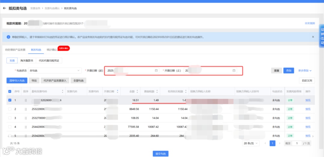 勾选状态选择 “未勾选”,输入相关查询条件,然后点击【查询】按钮,则在勾选操作区显示符合查询条件的发票。