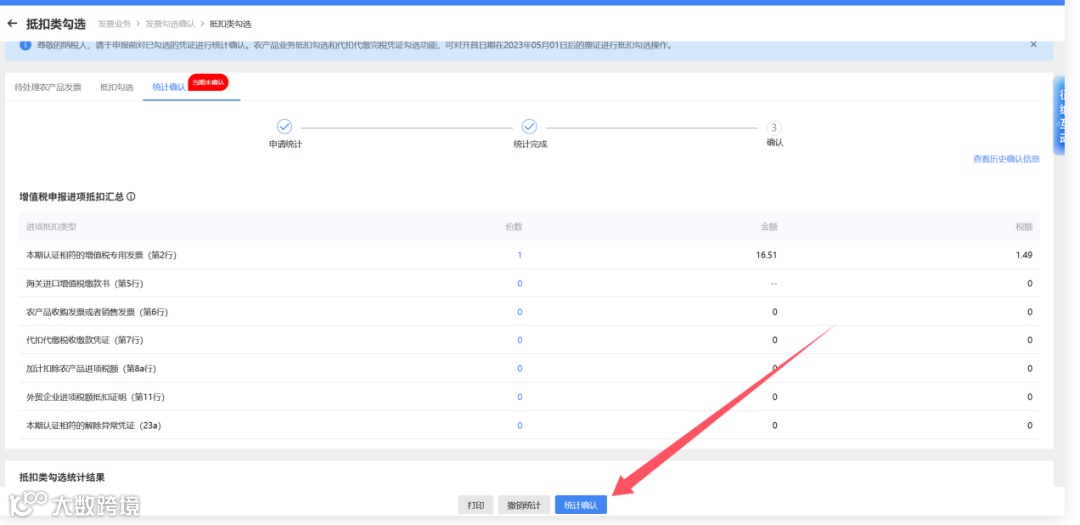 当月所属期相关发票全部抵扣勾选后,依次点击【税务数字账户】-【发票勾选确认】-【抵扣类勾选】-【统计确认】,进入发票统计确认界面,进行发票勾选汇总操作。