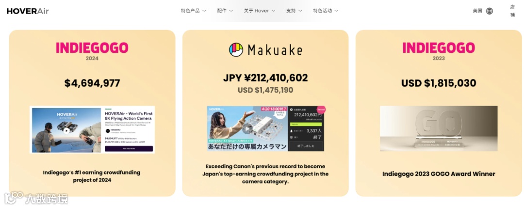 图源: HoverAir产品能力向前推进,市场反馈也随之跟上。X1 Pro系列众筹开启两小时,金额突破100万美元,最终完成超500万美元的众筹成绩,吸引近6500人参与。