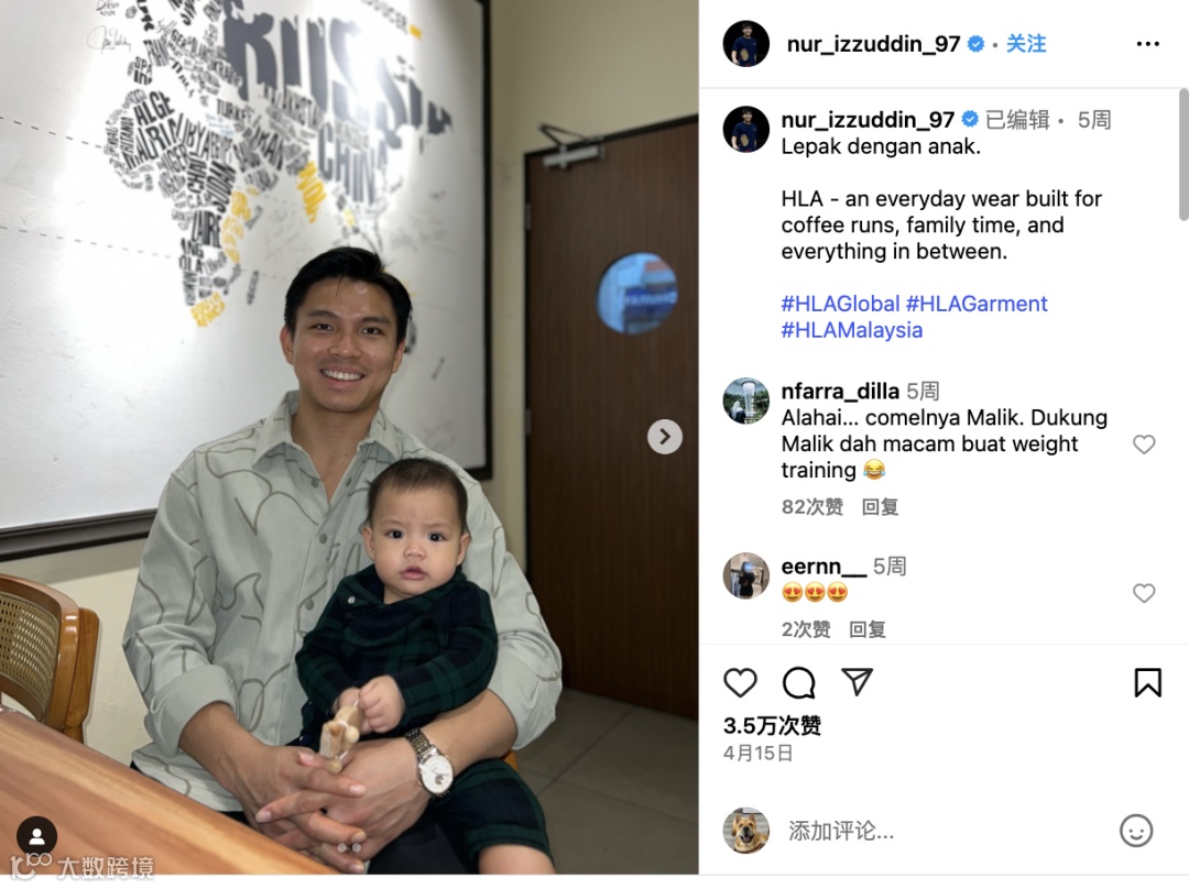 通过这种方式,他能够有效地将品牌的形象传递给更广泛的受众群体。Nur在其Instagram账号上发布了一条动态,展示了他与孩子共度休闲时光的照片,并介绍了HLA品牌。在这篇帖子中,他提到:“HLA - an everyday wear built for coffee runs, family time, and everything in between”,强调了HLA品牌的日常适用性和舒适性,使其与普通人的日常生活紧密相连。