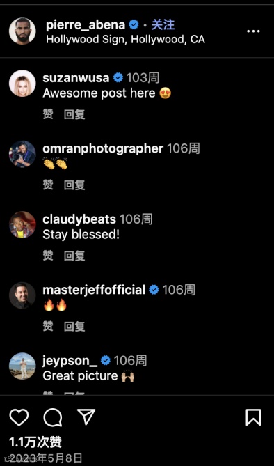 互动数据也同样亮眼,该条帖子收获了超过1.1万次点赞,评论区也涌现出大量正面反馈,诸如“Great picture”、“Stay blessed”等留言层出不穷,显示出Pierre在粉丝群体中的强大号召力和良好的口碑基础。