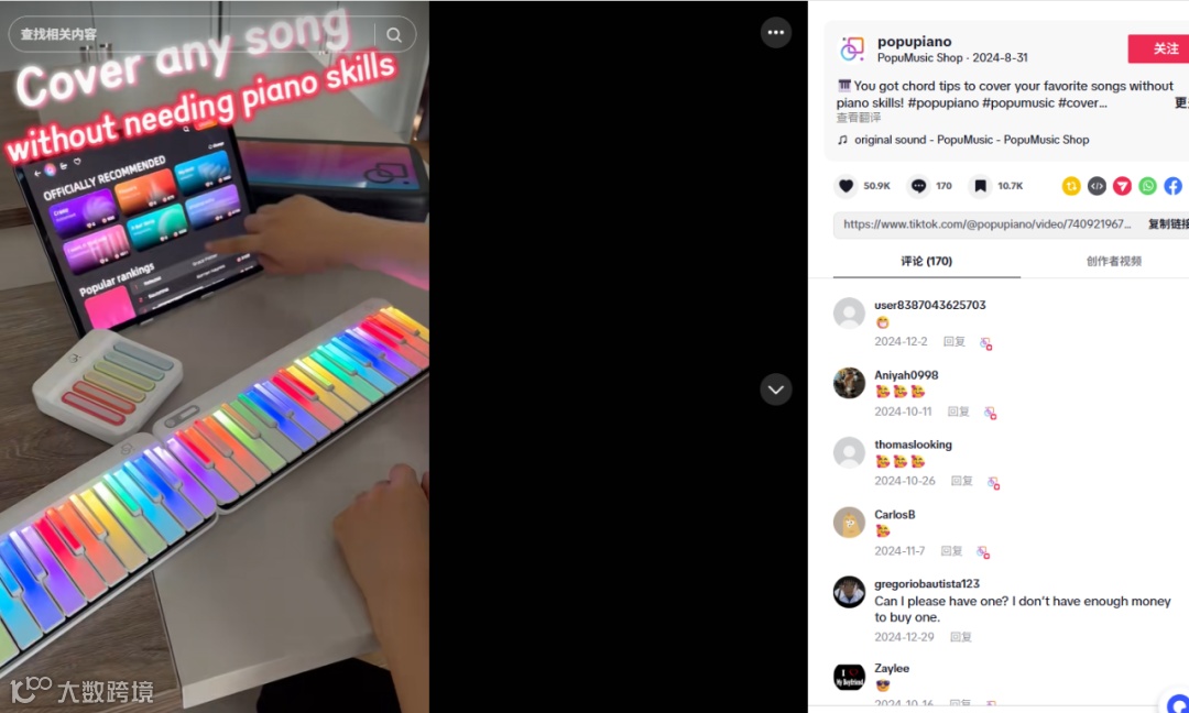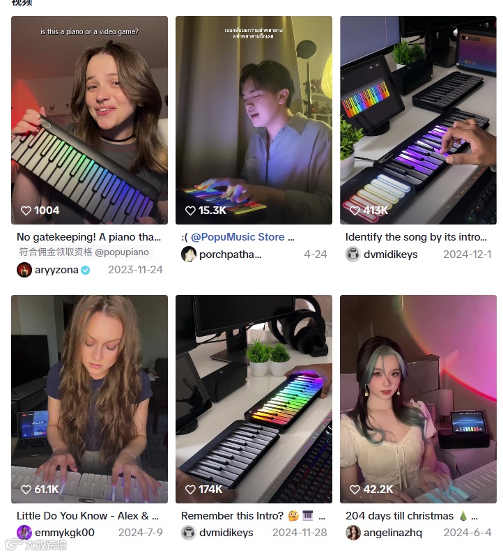 其中,一条展示智能键盘的视频在TikTok展开传播,累计播放量超160万次。视频通过极具视觉冲击力的呈现方式,展现产品核心卖点——当用户演奏时,键盘会随旋律节奏实时变换RGB灯光色彩,形成音乐与光效的完美互动。