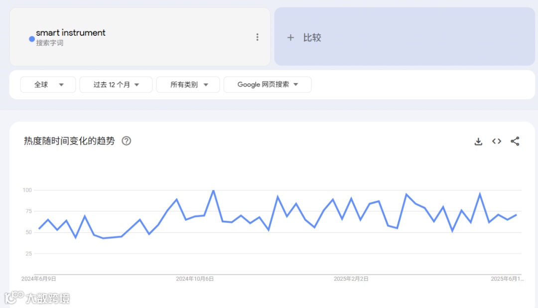 谷歌趋势搜索“smart instrument”(智能乐器)显示,过于12个月,全球范围内对该品类搜索热度在46-100的区间,智能乐器在全球范围内潜力巨大。