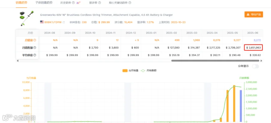 过去三个月,这一产品在北美电商平台的月均销售额超过200万美元,稳稳占据亚马逊割草机类目畅销榜榜第三。