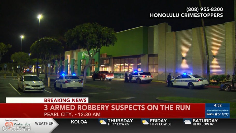 援引夏威夷即時新聞:檀香山警方週四(2月26日)接獲報案,指珍珠城發生一級搶劫案。警方稱,案件發生在凌晨12點30分左右,地點位於Kuala街的Petco寵物店停車場。警方表示,三名男性受害者(分別為19歲和兩名21歲)當時正在停車場,三名步行的男性嫌疑人靠近他們。其中一名嫌犯亮出一把銀色左輪手槍,並索取他們的財物。受害者的珠寶和現金被搶走。嫌犯徒步逃往Walmart附近,可能乘坐一輛不明身份的白色四門轎車逃離現場,案件中無人受傷。嫌疑人被描述為三名身穿連帽衫、黑色牛仔褲、滑雪面罩並佩戴腰包的男子。案件仍在調查中,任何知情人士請撥打911或滅罪熱線(808)955-8300提供線索。