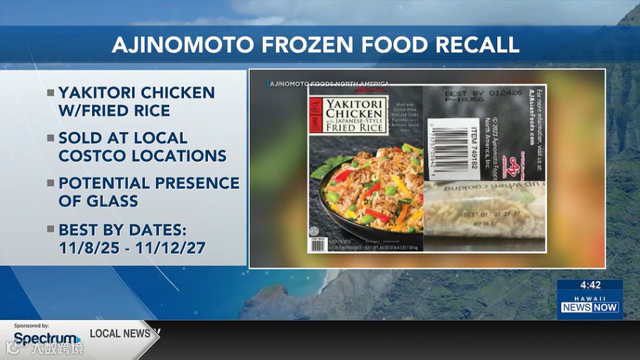 援引夏威夷即時新聞:部分Costco會員已收到召回通知,原因是產品可能含有玻璃碎片。部分顧客已收到電子郵件,部分顧客則接到電話。此次召回的產品為2024年12月3日至2026年2月20日期間購買的味之素烤雞配日式炒飯。味之素食品北美公司與美國農業部合作,宣佈自願召回部分批次的味之素烤雞配日式炒飯,原因是產品中可能含有玻璃碎片。受影響產品的保質期編碼範圍為2025年11月8日至2027年1月12日。保存期限印在包裝盒側面或單包裝袋上,格式為MMDDYY(月、日、年)。