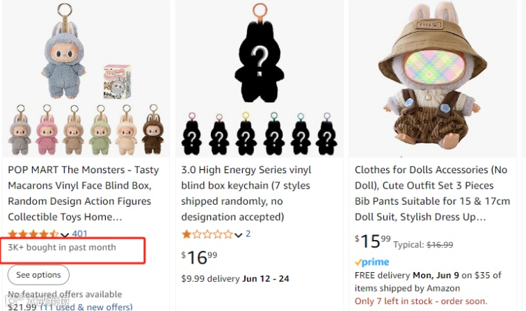 盲盒玩法更成侵权重灾区,如第三代搪胶毛绒产品“前方高能”系列广受仿冒。在亚马逊上,各种Labubu周边产品琳琅满目,单款销量轻松破百。