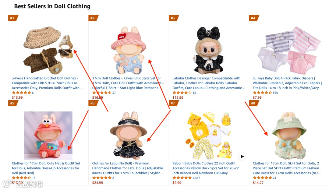 在亚马逊美国站,“Labubu”相关关键词搜索量连续四周稳居玩具类目前三,平台上相关产品链接高达2000多条,部分产品近一个月销量突破5000单。