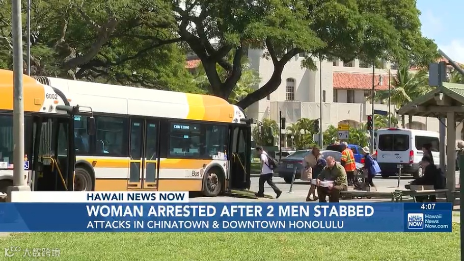 援引夏威夷即時新聞:週一(2月23日)上午10點15分左右,檀香山警方和緊急醫療服務中心(EMS)人員接獲報警,稱檀香山市政府附近發生一起疑似持刀傷人事件。據警方稱,一名30歲女子在Smith街和Beretania街附近的公車站刺傷了一名55歲男子。警方表示,嫌犯隨後登上了一輛公車,並在King街和Punchbowl街附近刺傷了一名60歲男子。嫌犯據稱徒步逃竄,穿過Kawaiahao公墓,但很快在South街和Kapiolani大道附近被警方找到並逮捕,過程中未發生任何意外。