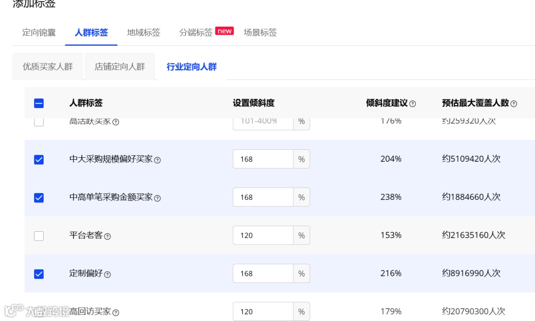 想要提升大买家询盘量,必须对重点人群进行针对性投放。L1+买家活跃度高、成交意愿强,应设为必投人群。同时,行业定向标签中如“中大采购规模偏好”、“定制偏好”、“中高MOQ偏好”等也是大买家的重要特征,这些人群标签需进行竞价溢价。