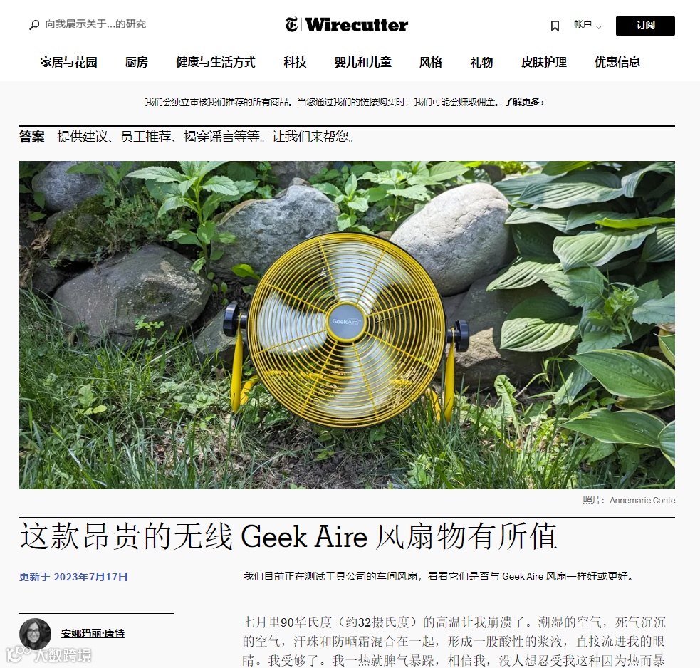 2023年,Geek Aire风扇登上纽约时报旗下的Wirecutter购物指南网站,并被推荐为“超越大多商超风扇”,顶级媒体的推荐加持下Geek收获了大量意向消费者。