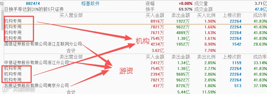 可以看到机构是正规军,也就是一些公募、私募,一般在龙虎榜就显示机构专用;而游资就是那些大户、牛散,一般在龙虎榜就选手某某营业部。