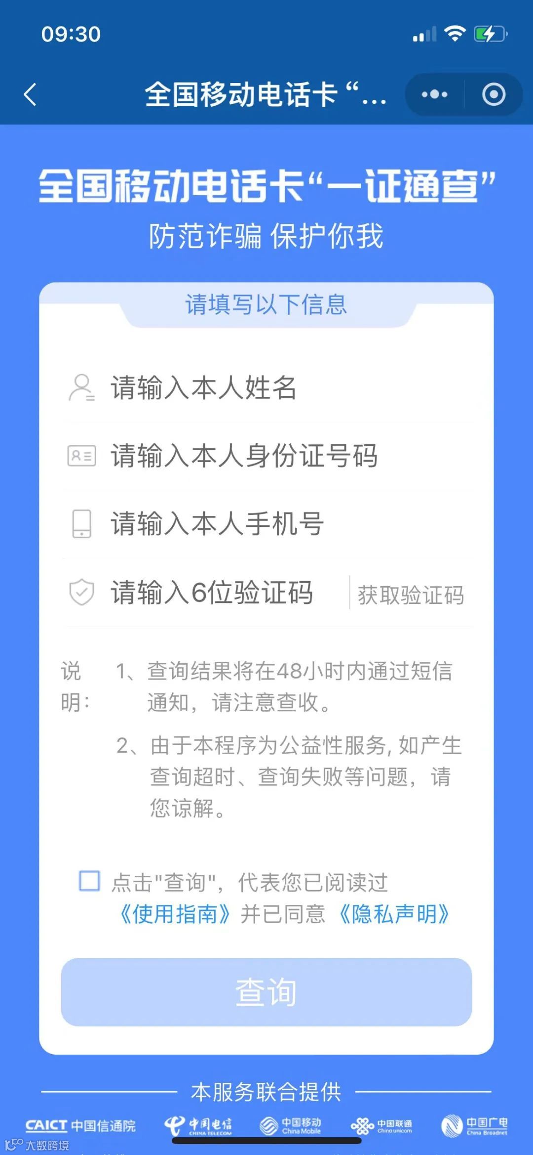 - 进入“电话卡一证通查”服务页面;
