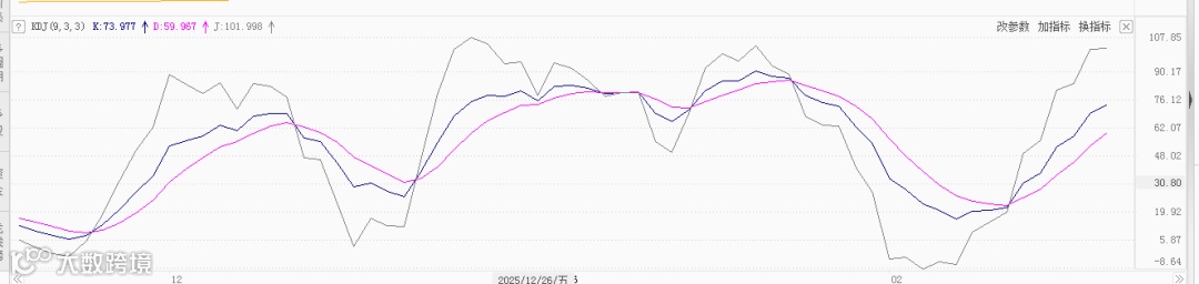 J线波动最大,有时候能冲到100以上,有时候能跌到负数。专门用来判断极端行情和转折点。