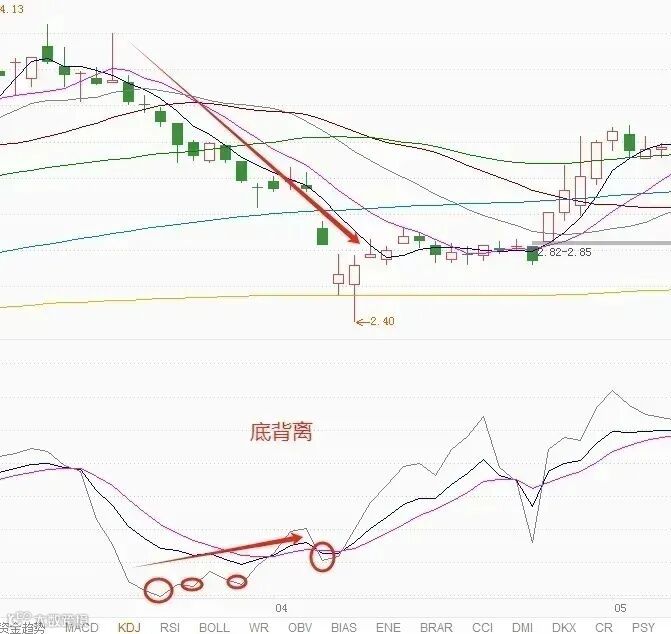 反过来,底背离就是股价还在创新低,但KDJ已经不再往下了,说明跌不动了,往往底部快到了。