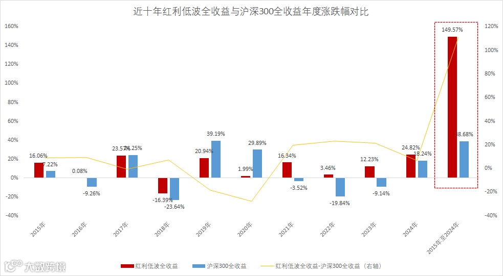从2015年至2024年,红利低波全收益的累计涨跌幅为149.57%,年化涨跌幅为9.86%,同期大幅跑赢沪深300全收益;