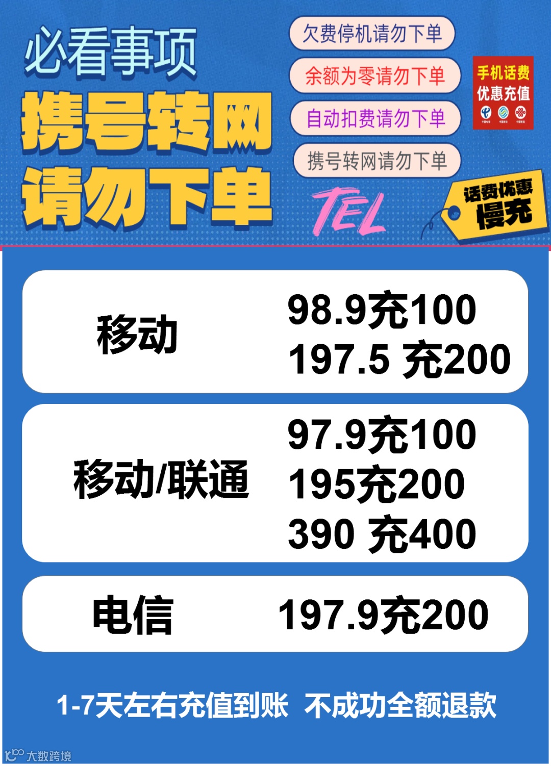 【全国三网话费充值】195充200元话费,1-7天左右到账,不成功全额退款。