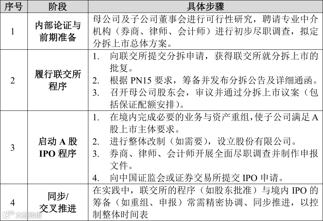 港股上市公司分拆子公司A股上市的大致流程如下表所示: