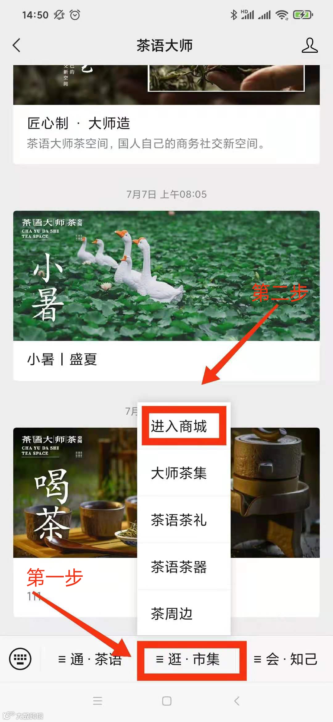 打开方式2:关注“茶语大师”公众号,点击菜单栏“逛·市集—进入商城”,进入小程序。