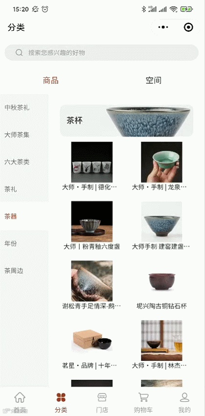 点击『分类』页面的“商品”列表,可以查看所有在售茶、器产品,进行下单购买,可选择快递到家,或线下自提。