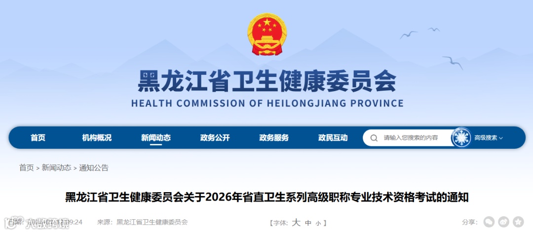■ 考试对象:符合《黑龙江省深化卫生专业技术人员职称制度改革实施方案》(黑人社规〔2022〕4号)规定条件,拟于2026年申请参加卫生高级专业技术职务任职资格评审的中省直有关单位人员,均可报名参加考试。