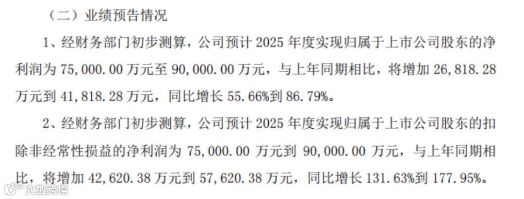 2025年全年,预计归母净利润为7.50亿至9.00亿,同比增长55.7%至86.8%;扣非净利润的预测区间与归母净利润相当,但同比增幅高达131.6%至178.0%。
