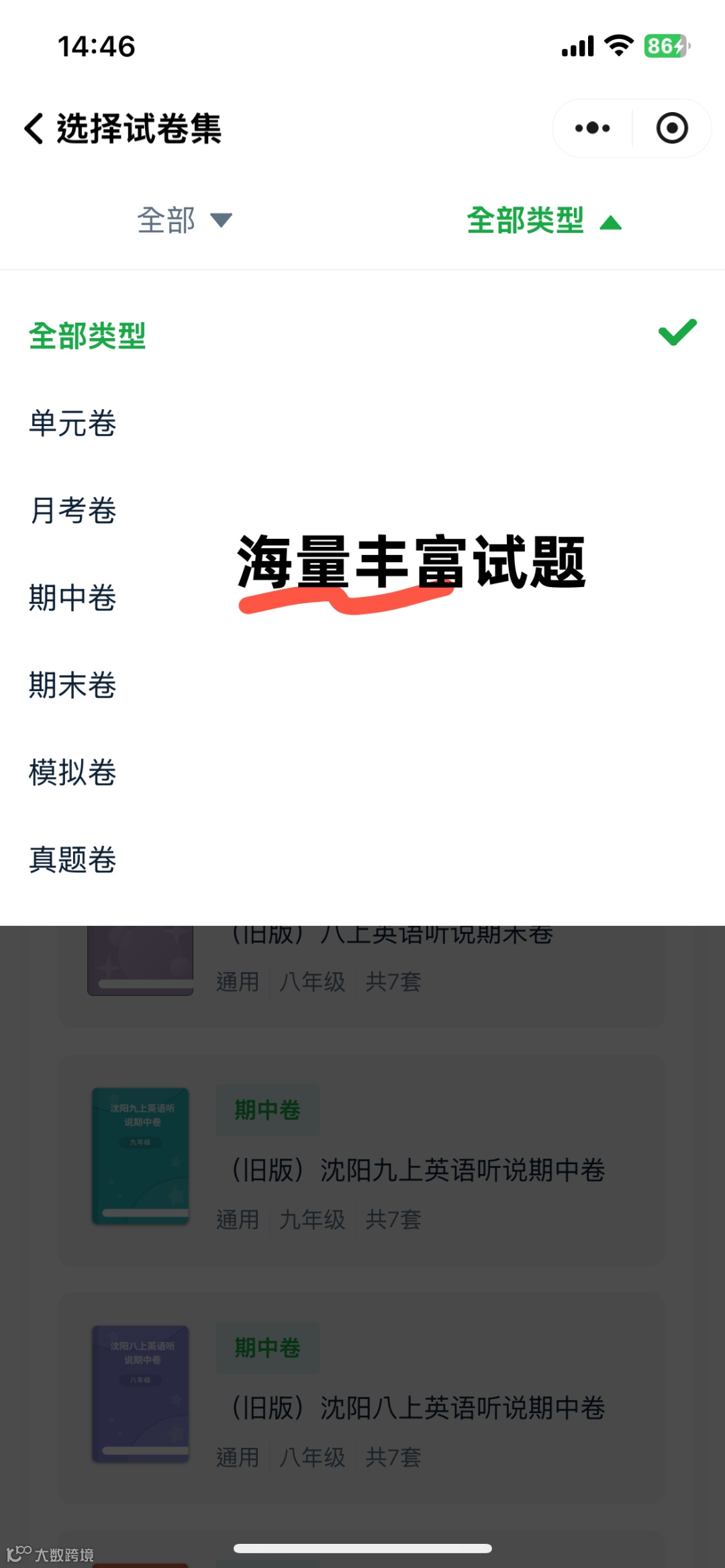 在单元复习的时候,老师也可以在灵语通小程序【听说套卷】,选择【单元卷】推送给学生训练,以达到巩固课文基础和熟悉听说题型的目的。