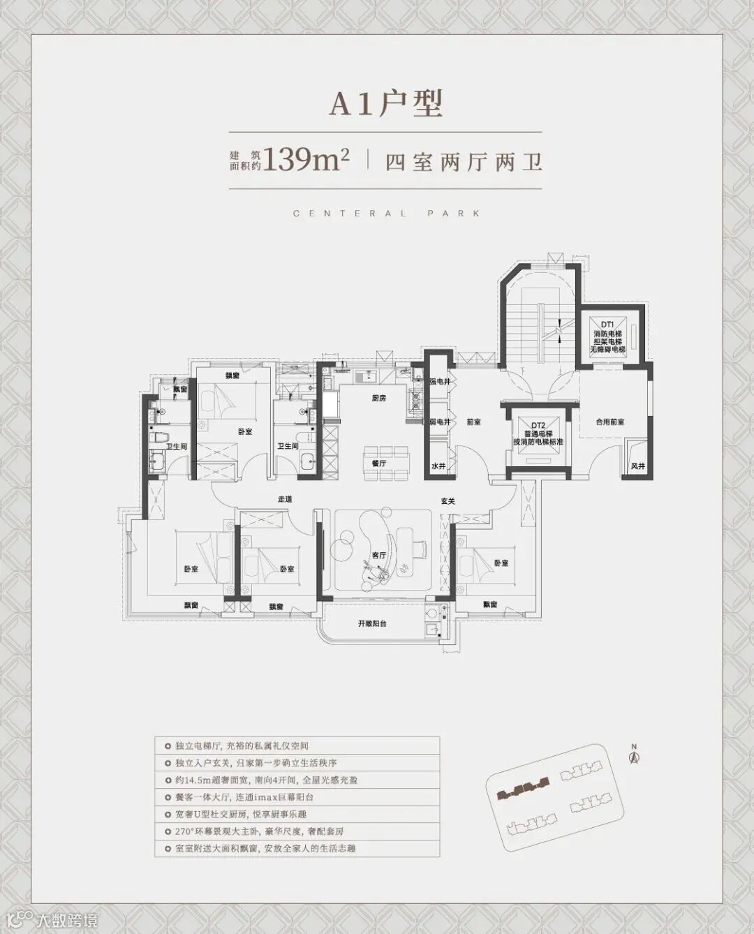 4#楼户型为建面约139㎡四房,拥有“个性大四房+15.05米IMAX大面宽+一梯一户(边套)+270°转角飘窗”构建纯粹改善设计。