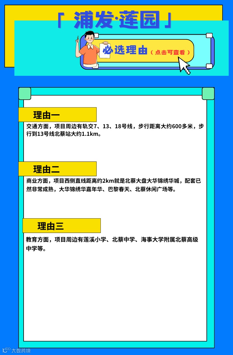 商业方面,项目西侧直线距离约2km就是北蔡大盘大华锦绣华城,配套已然非常成熟,大华锦绣华嘉年华、巴黎春天、北蔡休闲广场等。