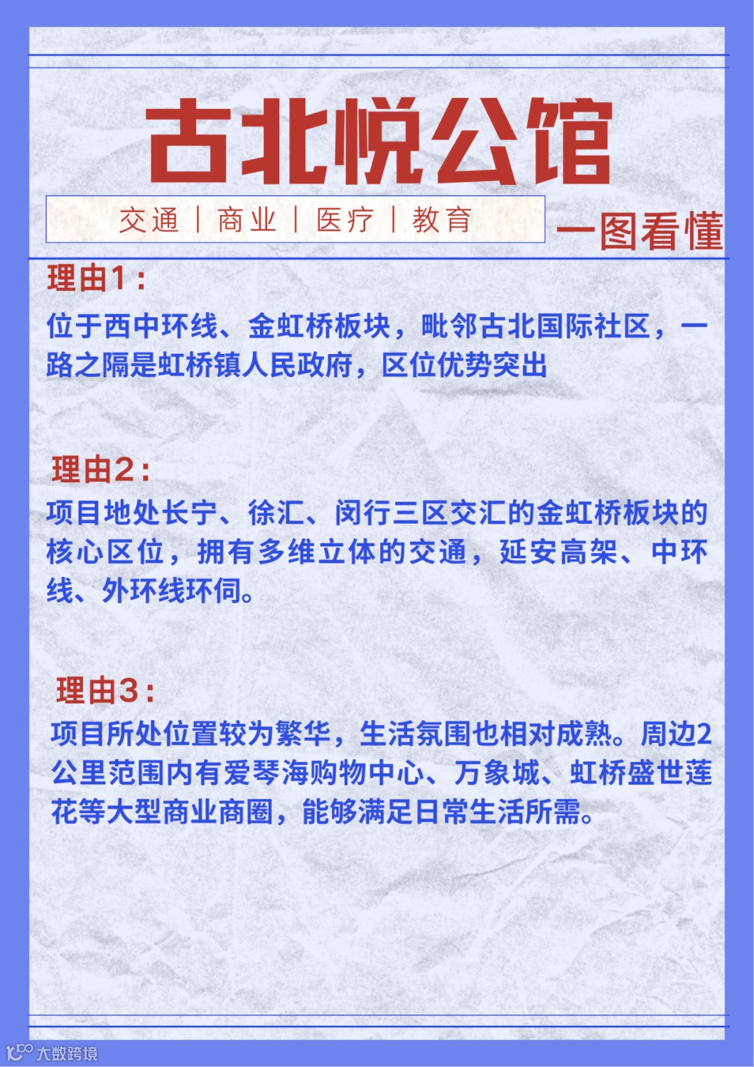 【古北悦公馆】板块上属于属于金虹桥,距中环线直线距离约800米,位于闵行区虹中路近红松路,步行到10号线龙溪路约1.8公里。